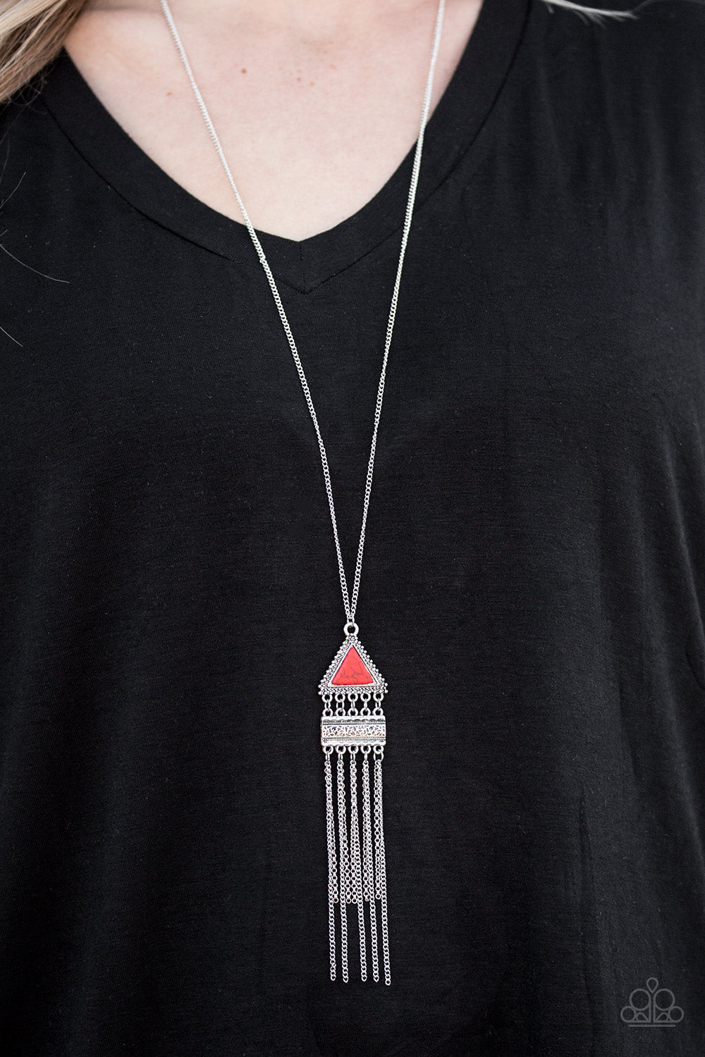 This long necklace features a triangle red riverstone pressed into a studded silver frame with a silver tribal frame attachment with silver chain fringe. Features an adjustable clasp closure. Includes one pair of matching earrings.