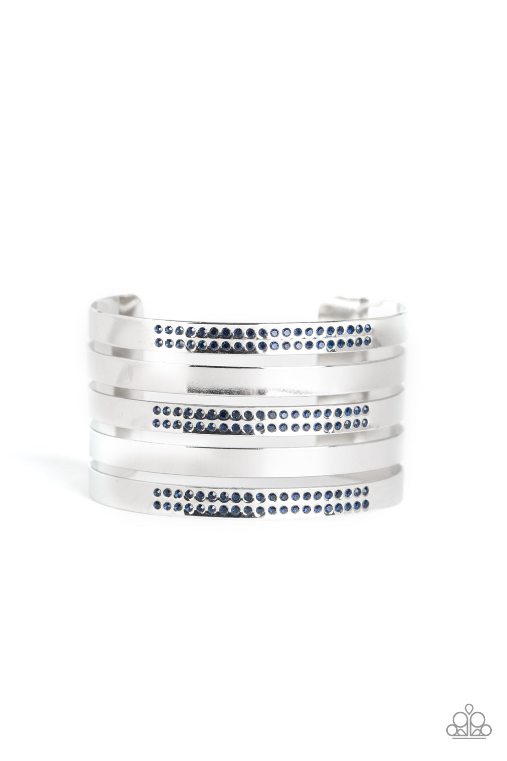 This adjustable cuff bracelet features smooth silver and glittery blue rhinestone accents on a stacked silver frame.