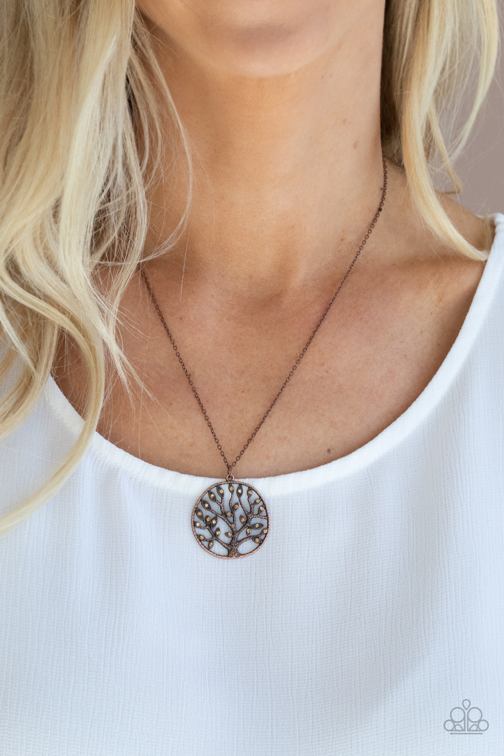 This short necklace features dainty copper branches dotted with topaz rhinestone adorned leaves that climb an asymmetrical copper frame to create a tree pendant. Features an adjustable clasp closure. Includes one pair of matching earrings.