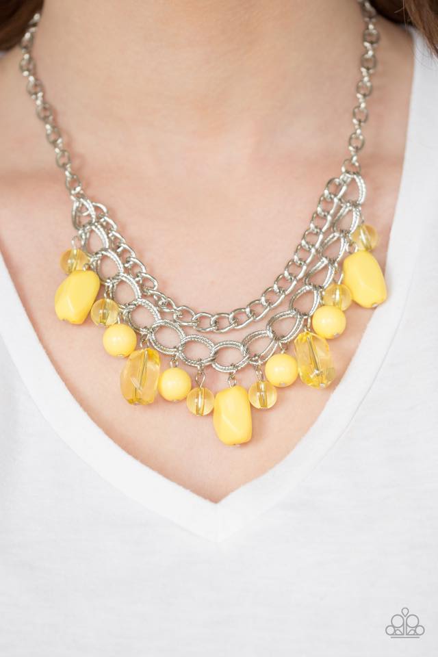 This short necklace features round and asymmetrical glassy and polished yellow beads at the bottom of a double-linked silver chain with a singular chain above the tassels. Features an adjustable clasp closure. Includes one pair of matching earrings.