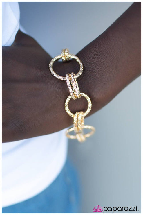 Four gold rings hammered into a diamond-cut pattern are connected by elongated gold links to create a simple, yet memorable design. Features an adjustable clasp closure.