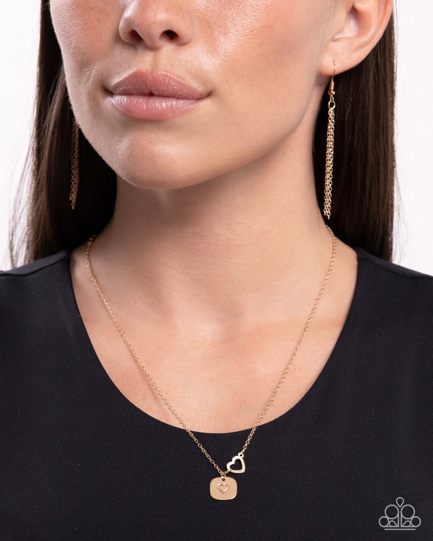 Gliding along a dainty gold chain, a thick heart-stamped rounded square pendant glides below the neckline. A gold silhouette interrupts the dainty chain for additional affectionate detail. Features an adjustable clasp closure.