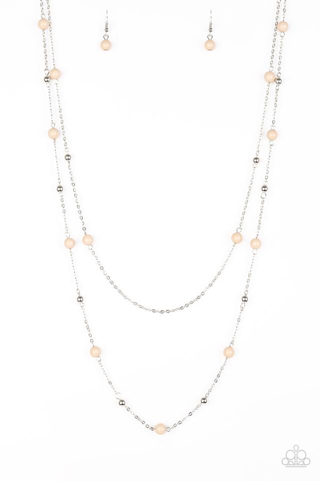 This long necklace features neutral brown and dainty silver beads that trickle down double silver chains. Features an adjustable clasp closure. Includes one pair of matching earrings.