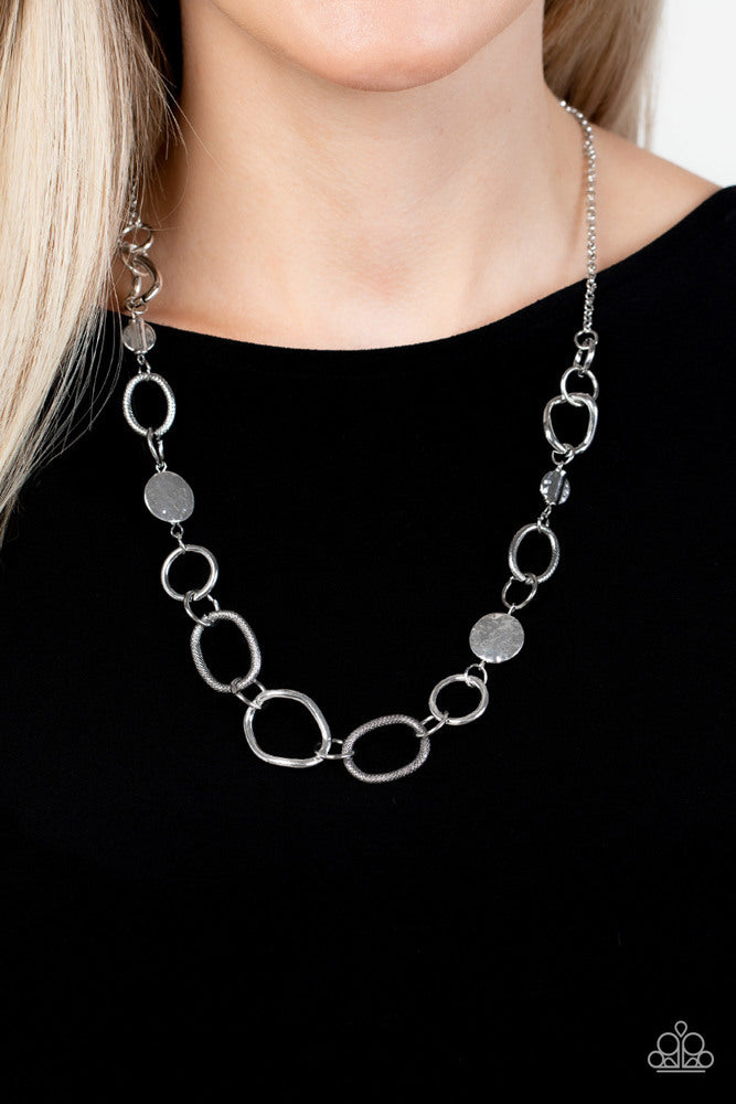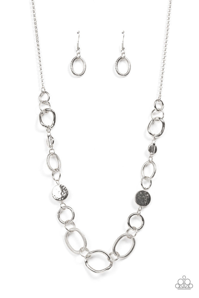 A mismatched assortment of hammered silver discs, textured silver links, shiny silver rings, and asymmetrical silver links boldly interlock below the collar for a gritty fashion. Features an adjustable clasp closure.