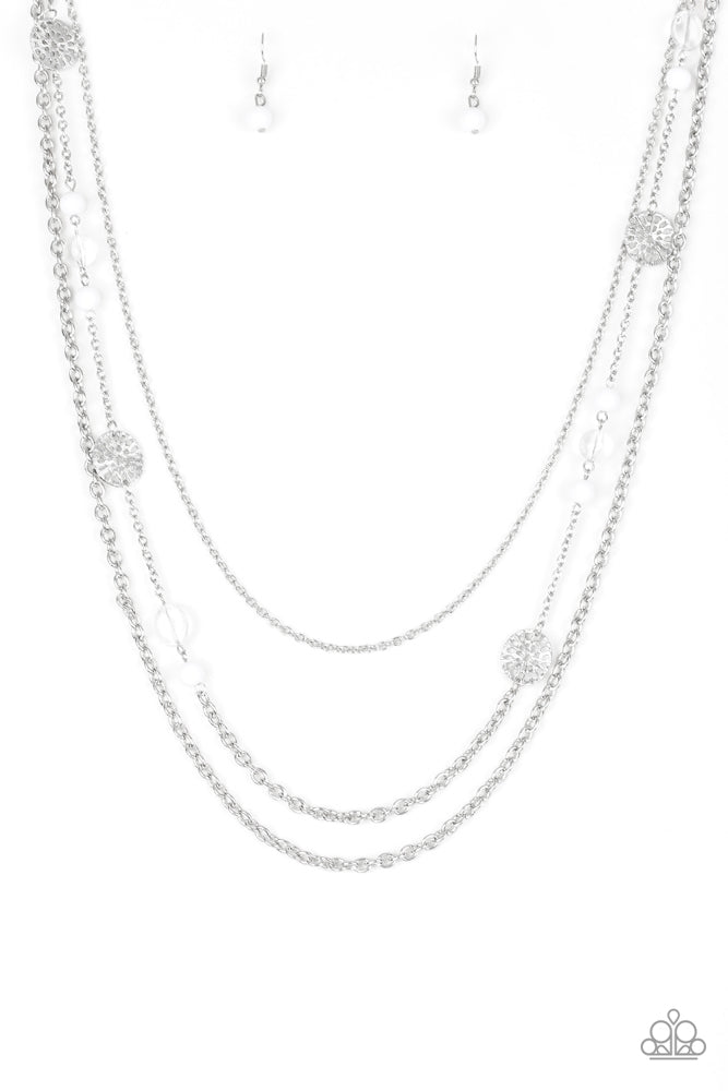 Ornate silver accents, glassy beads, and polished white beads trickle along strands of shimmery silver chains for a whimsical look. Features an adjustable clasp closure.