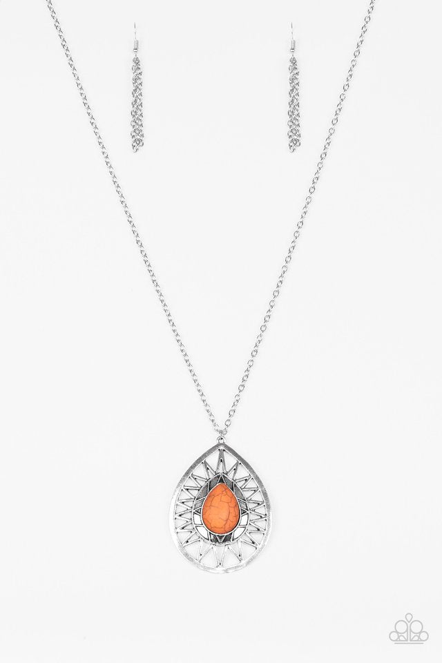 This long necklace features a orange teardrop riverstone pressed into the center of a large silver teardrop with sunburst patterns on a long silver chain. Features an adjustable clasp closure. Includes one pair of matching earrings.