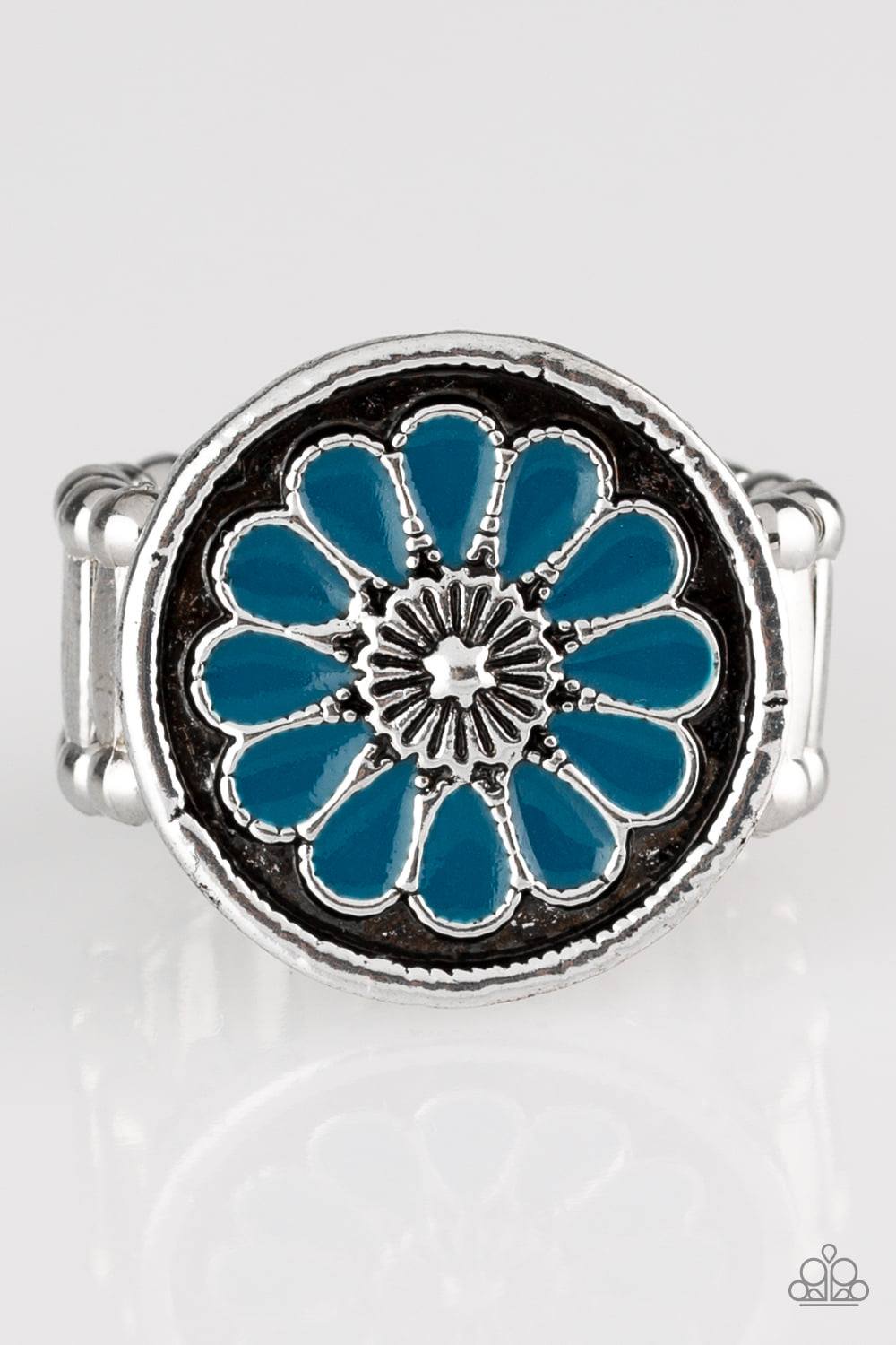 This ring features a blue floral pattern on a silver rounded frame. Features a stretchy band for a flexible fit.