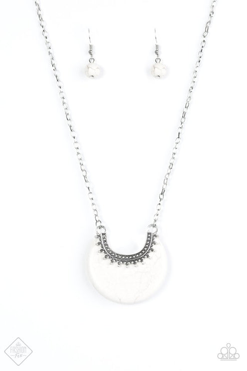 Chiseled into an earthy crescent, a white stone attaches to a studded silver frame, creating a bold artisanal pendant. Features an adjustable clasp closure.