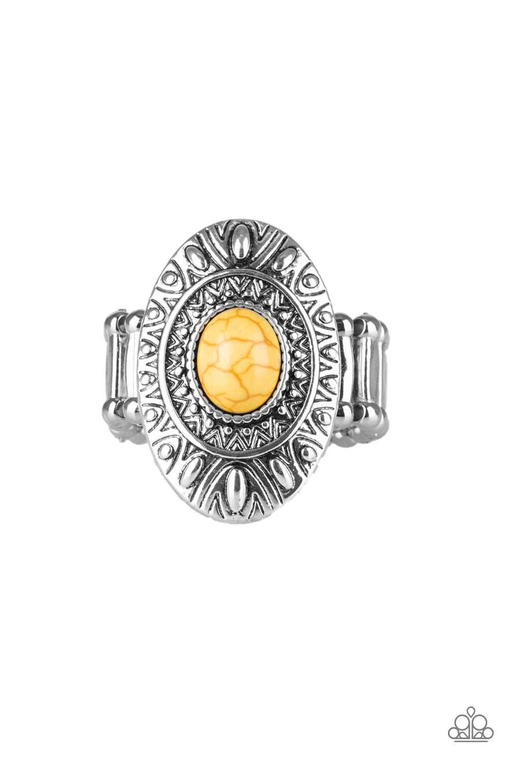 A sunny yellow stone is pressed into the center of a silver frame radiating with tribal inspired textures for a seasonal look. Features a stretchy band for a flexible fit.