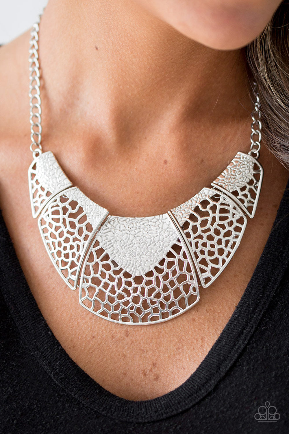 This short necklace features silver plate frames with metallic textures and airy patterns connect on a silver chain. Features an adjustable clasp closure. Includes one pair of matching earrings.