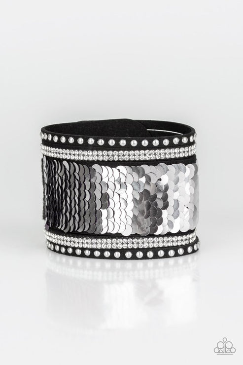 Shiny silver studs, glassy white rhinestones, and shimmering sequins are sprinkled across a thick black suede band that has been spliced into five glittery rows. Bracelet features reversible sequins that change from purple to silver. Features an adjustable snap closure.